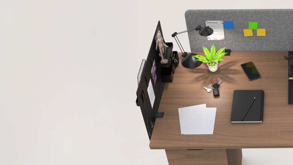 Créer un poste de travail modulable pour open space, conçu pour l’efficacité collective tout en préservant le confort individuel. Design sobre et professionnel : bois naturel, métal noir, panneaux acoustiques. Intègre rangements pratiques, séparations visuelles discrètes et surfaces optimisées pour ordinateur + tablette + documents.
